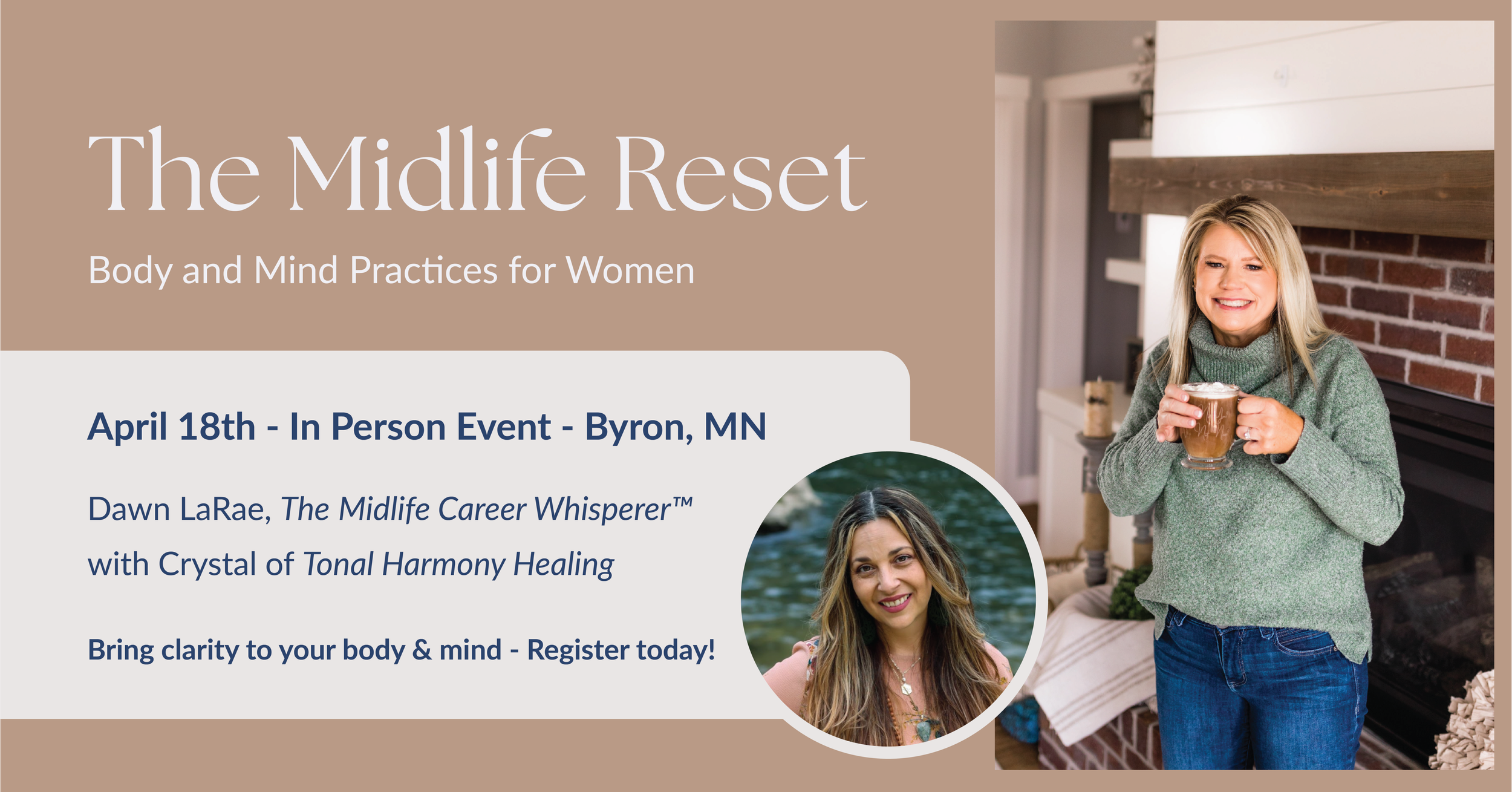 The Midlife Reset is a half-day retreat designed for women navigating the pivots that midlife brings: career shifts, changing bodies, relationships evolving, identity in flux. Through breathwork, guided reflection, somatic practices, and sound therapy, you'll leave with more than a good day — you'll leave with tools that actually work, because they address both body and mind.